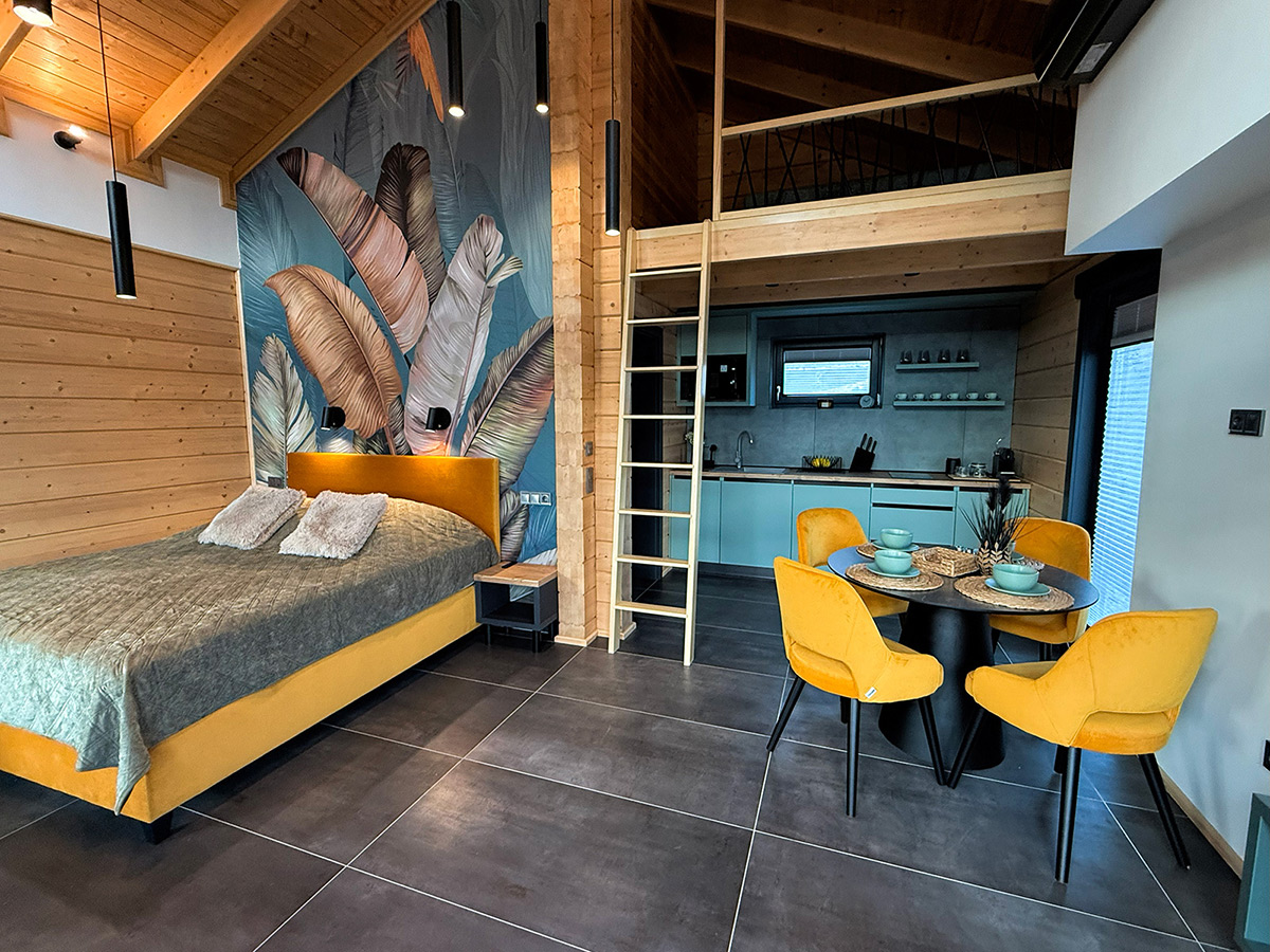 A gerendaszerkezetű, tágas vendégházat friss színek, könnyed formák és harmonikus részletek jellemzik. A belső világ nem harsány, inkább ösztönzően és finoman emeli a hangulatot anélkül, hogy túlzásba esne.